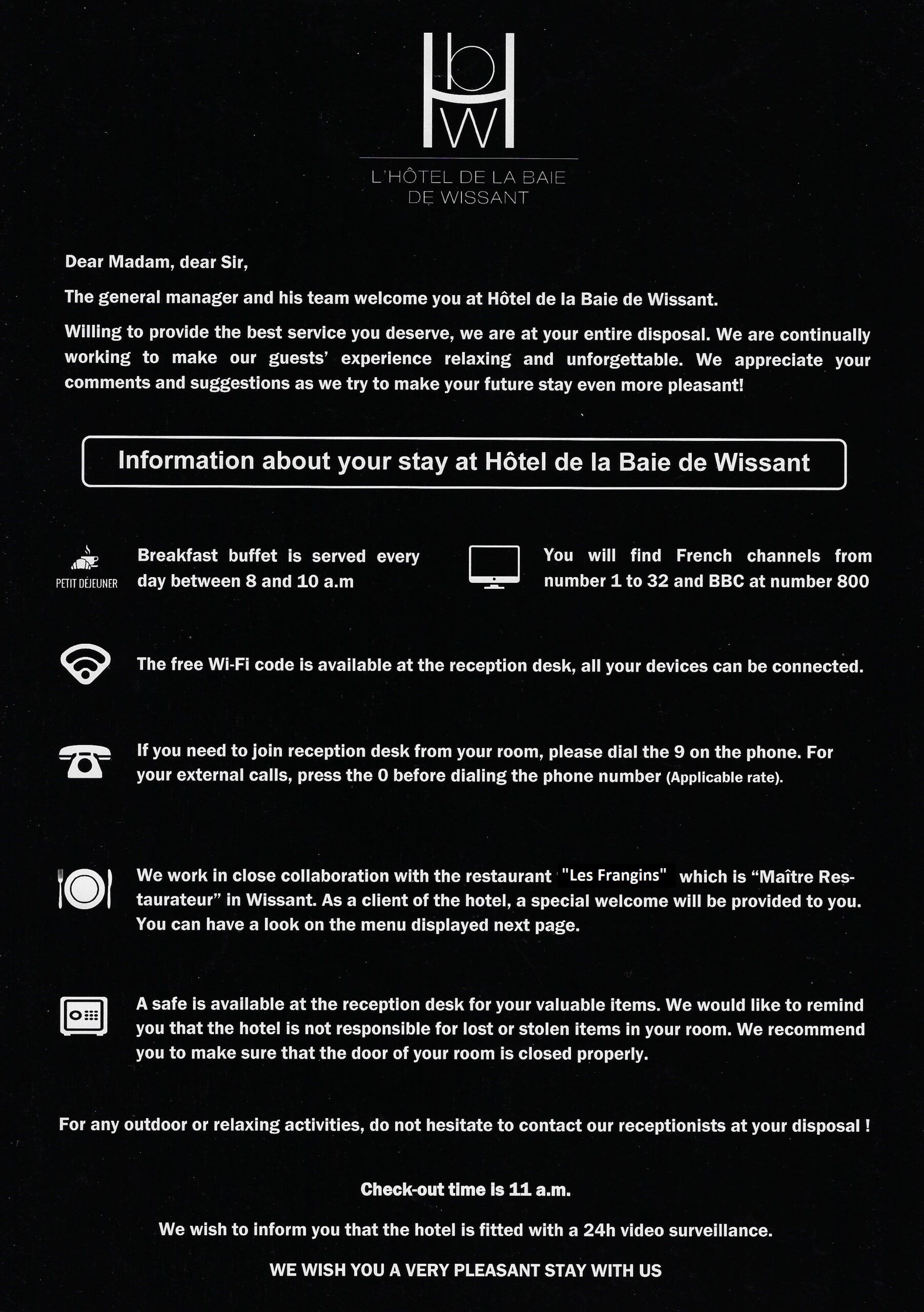 CODE WIFI: hotel2024 Numéros utiles: cliquez ici Pharmacie la plus proche: Sur la place de Wissant Numéro d’urgence: 06.60.63.36.25 Shopping :